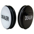 DEALER is carved in dark letters into the white acrylic, and with white letters into the dark acrylic on the reverse side.