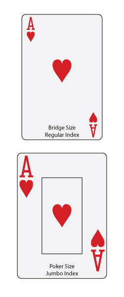 Playing Cards are identified by ranks and suits which are printed on to the face of the playing cards. Jumbo Index or Jumbo font refers to the size of the font on the cards. Playing cards are typically available in two or three different index sizes, such as Standard, Jumbo and Magnum indexes. Standard Index is the more traditional size font. Jumbo and sometimes even Magnum index are available from some manufacturers. Magnum index or low vision index are great for people who have vision impairments.
