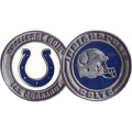 Officially licensed NFL Team Challenge Coin Card Guard. Two sided, team logo on one side and helmet design on other side. 2" across, pewter. Ships with Air Tite Holder.